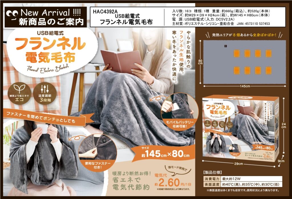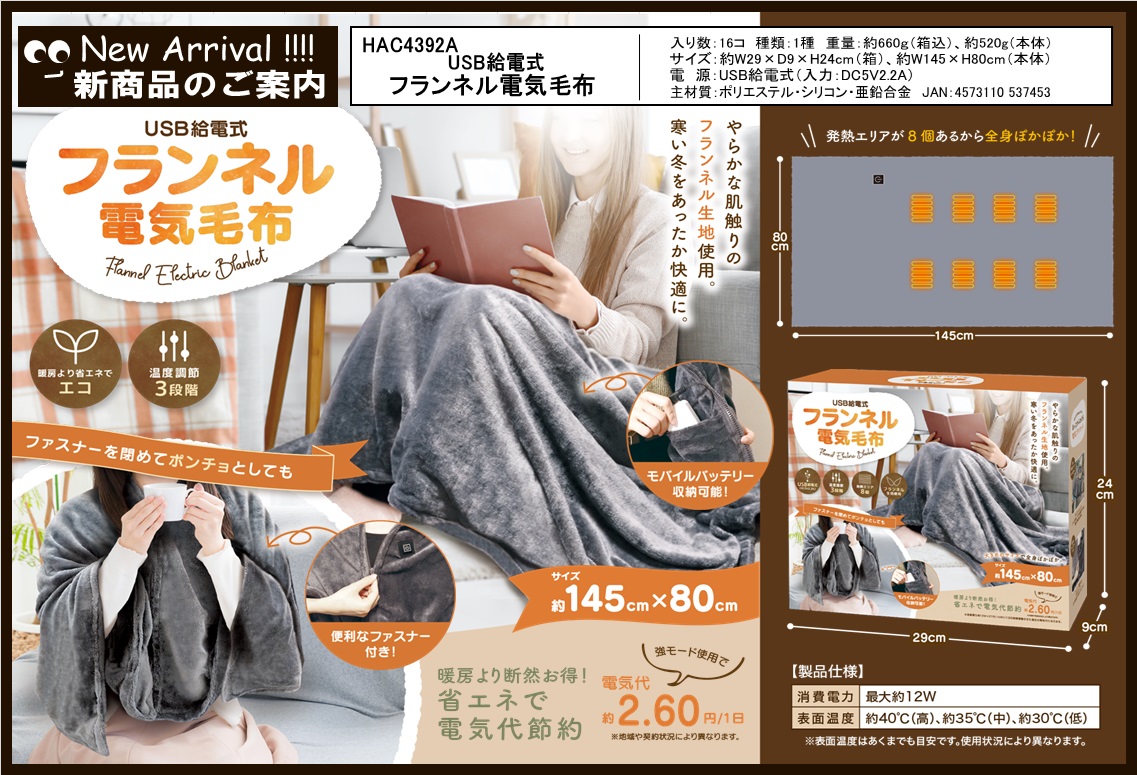 ハック USB充電式フランネル電気毛布 by onozuka · 2025年11月11日 HAC4392A USB充電式フランネル電気毛布 この商品についての問い合わせ 氏名〈必須〉 電話番号〈必須〉 メールアドレス〈必須〉※メールアドレスが正しくない場合は返信できません お問い合わせ内容