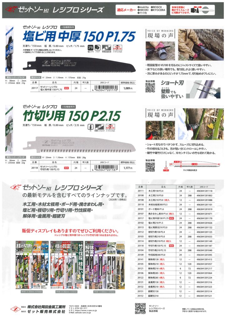 ゼット販売 レシプロシリーズ by ohtake · 2025年12月5日 塩ビ用中厚150P1.75・竹切り用150P2.15 PDF資料 この商品についてのお問合せ 氏名〈必須〉 電話番号〈必須〉 メールアドレス〈必須〉※メールアドレスが正しくない場合は返信できません お問い合わせ内容