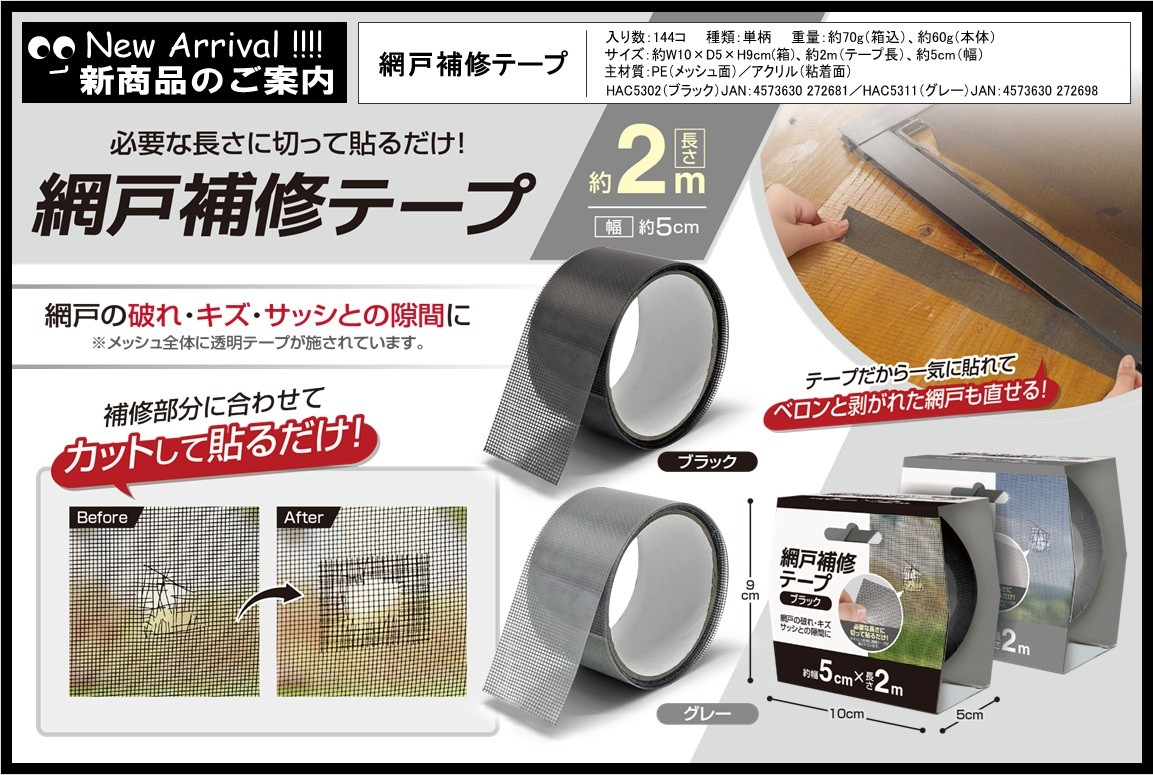 ハック 網戸補修テープ by onozuka · 2026年2月4日 HAC5302,5311 網戸補修テープ この商品についての問い合わせ 氏名〈必須〉 電話番号〈必須〉 メールアドレス〈必須〉※メールアドレスが正しくない場合は返信できません お問い合わせ内容