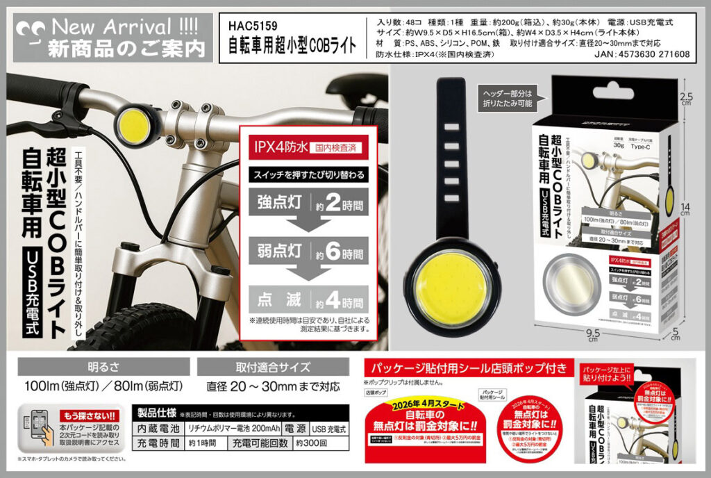 ハック 自転車用超小型COBライト HAC5159 by onozuka · 2026年3月11日 HAC5159 自転車用超小型COBライト この商品についての問い合わせ 氏名〈必須〉 電話番号〈必須〉 メールアドレス〈必須〉※メールアドレスが正しくない場合は返信できません お問い合わせ内容