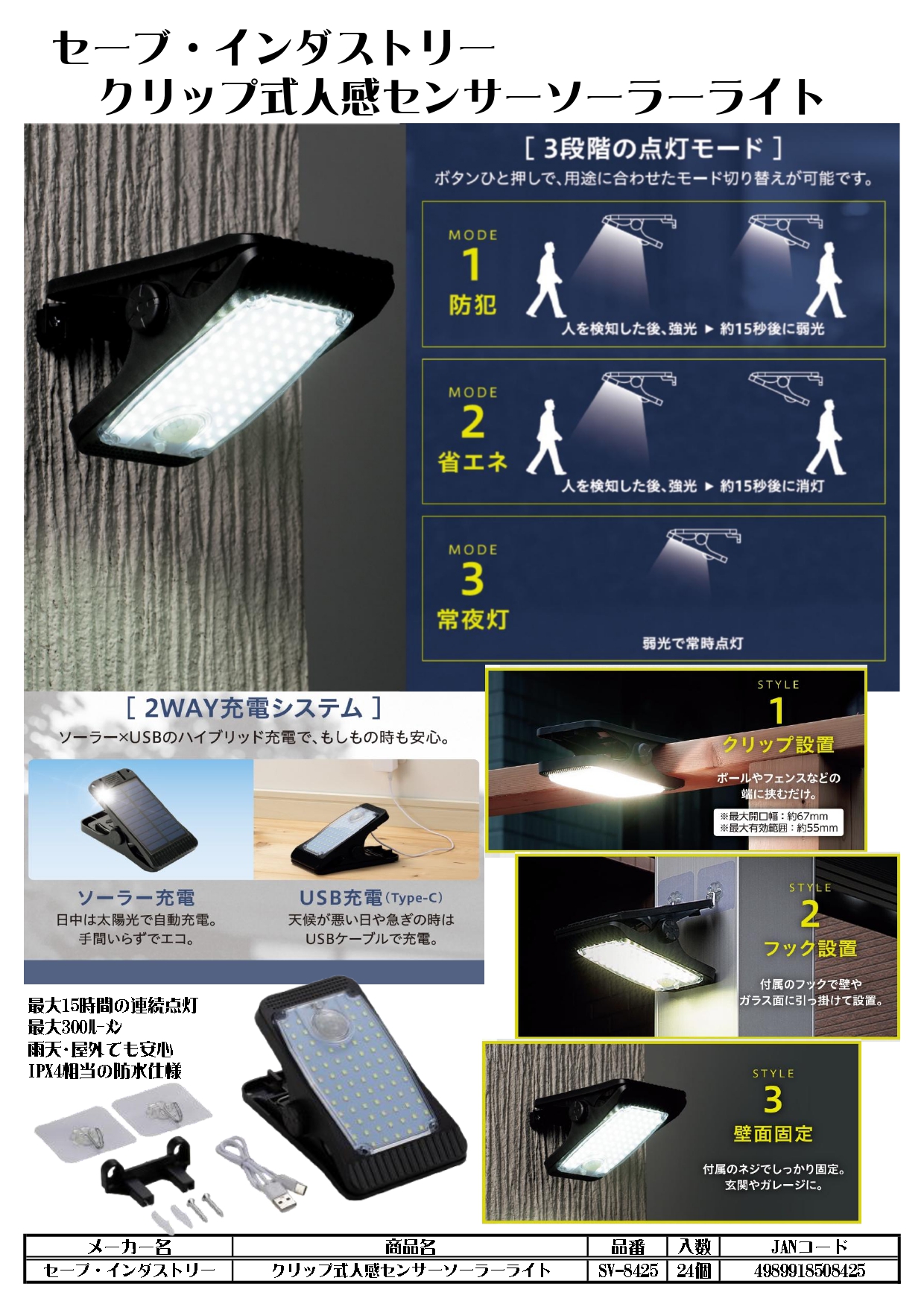 セーブ・インダストリー クリップ式人感センサーソーラーライト by ohtake · 2026年3月28日 SV-8425 PDF資料 この商品についてのお問合せ 氏名〈必須〉 電話番号〈必須〉 メールアドレス〈必須〉※メールアドレスが正しくない場合は返信できません お問い合わせ内容