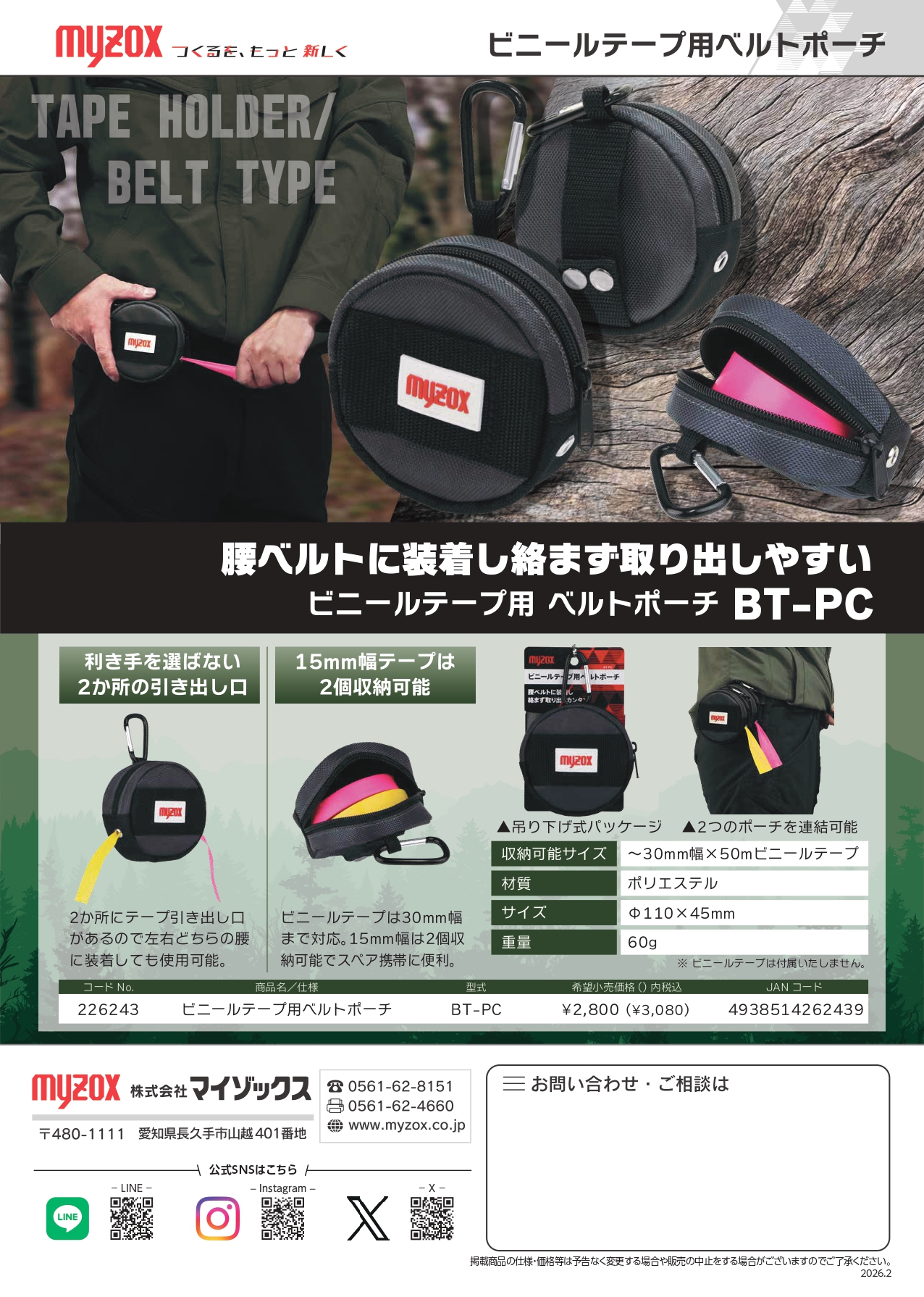マイゾックス ビニールテープ用ベルトポーチ BT-PC by yagi · 2026年4月14日 MZベルトポーチBT-PC-PDF資料 この商品についてのお問い合わせ 氏名〈必須〉 電話番号〈必須〉 メールアドレス〈必須〉※メールアドレスが正しくない場合は返信できません お問い合わせ内容